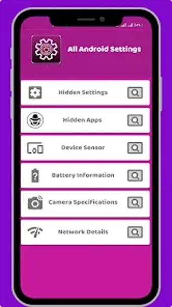 كما يتضمن إعدادات أندرويد الخفية وظيفة للعثور على جميع التطبيقات الخفية على هاتف المستخدم. تمكّن هذه الخيارات المستخدمين من القيام بأي إجراء باستخدام تطبيق إعدادات أندرويد الخفية وتوفير جميع معلومات الحساسات مثل الحساس المغناطيسي وحساس الضوء وحساس الكشف الذكي.
